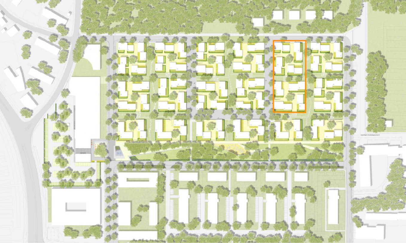 Über den Grünordnungsplan für das Gelände der ehemaligen Pionierkaserne hinaus entwickeln wir zwei Wohnfelder innerhalb des Gebietes. Die Wohnfelder sind gekennzeichnet durch einen zentralen Gemeinschaftsplatz, der durch die umgebende Bebauung, sowie durch eine differenzierte Gliederung von privaten und öffentlichen Freiräumen definiert wird. Von besonderer Bedeutung ist die allseitige Erschließung der umgebenden verbindenden Grünkorridore des Gesamtareals von den zentralen Gemeinschaftsflächen aus.