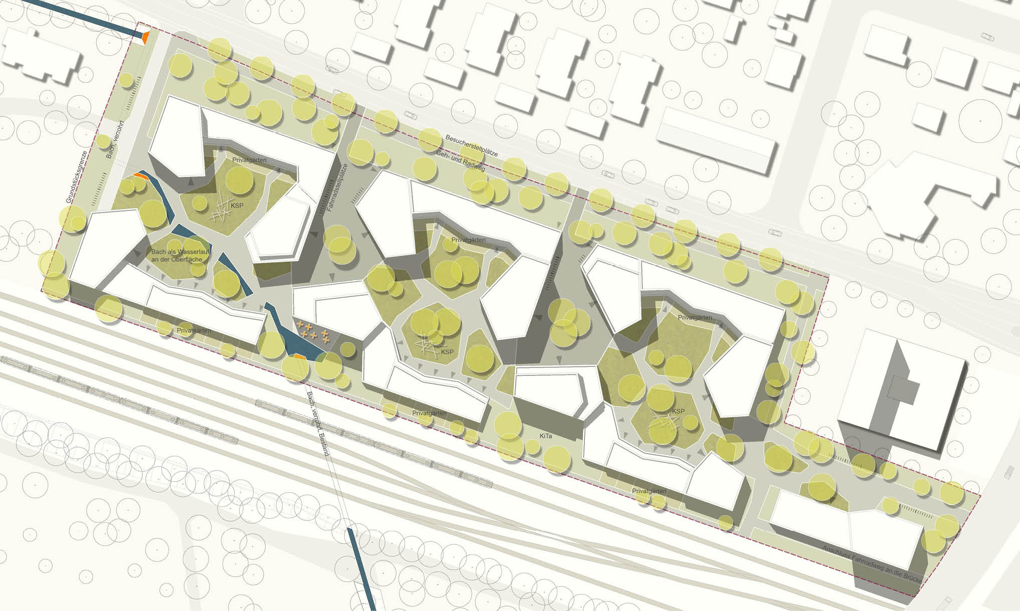 In den Freiräumen setzt sich setzt sich die Formensprache der Gebäude fort und entwickelt sich zu einem differenzierten Netzwerk aus Grünflächen, Platz- und Wegeflächen.