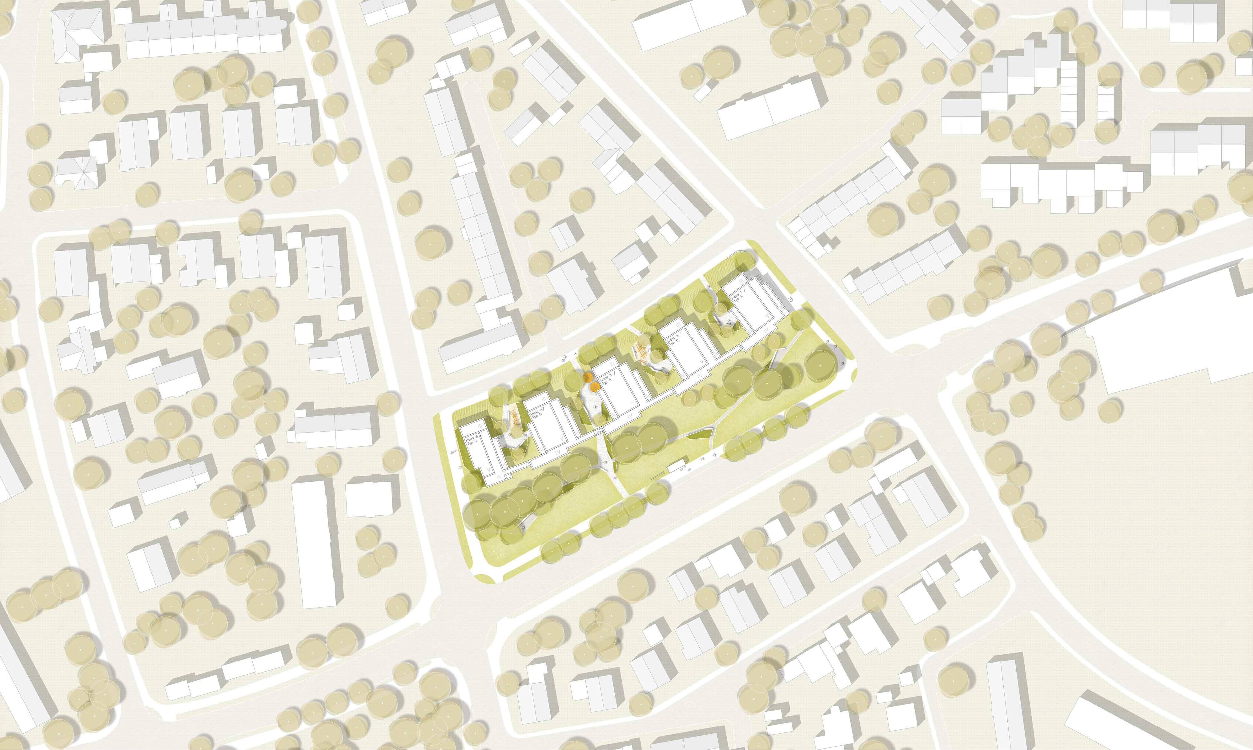 Durch die städtebauliche Setzung entstehen vier dreiseitig geschlossene Höfe, die jeweils ein eingenständiges Gepräge erhalten und klare Indentitäten entwickeln. Dafür werden die jeweils gleichen Freiraumelemente zu immer neuen räumlichen Gefügen modelliert: Eine platzartige Mitte wird von Strauch und Staudenpflanzungen gerahmt und mit Aufenthalts- und Spieleinrichtungen ausgestattet.