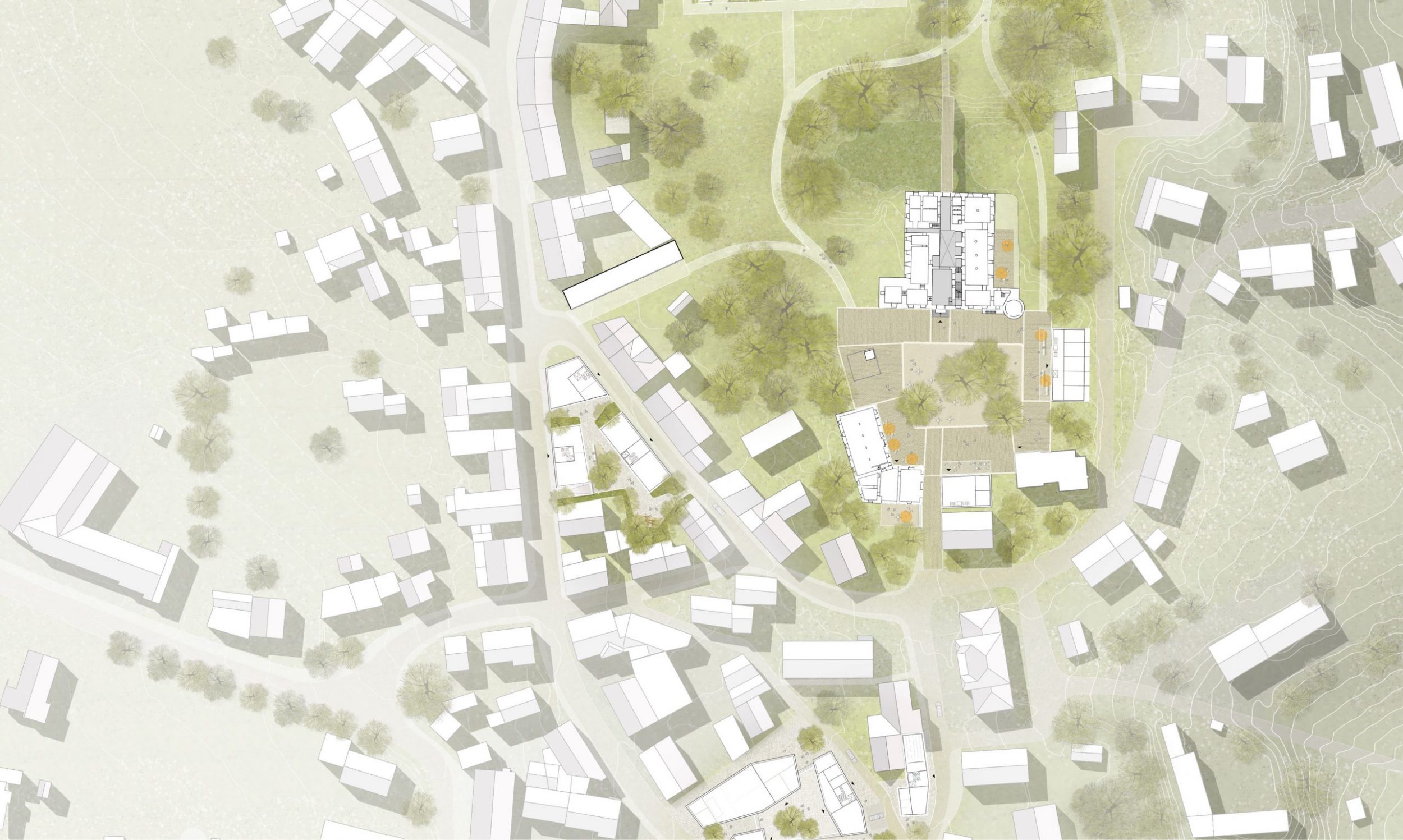 Durch die U-förmige Anordnung von 3 Einzelbaukörpern wird ein einladender offener Platz gebildet, der als Plattform, Freiluftbühne und Serenadenhof dienen kann. Durch das Prinzip der Fugen werden vorhandene Gassen fortgeführt und neue Verbindungswege angeboten. Die Malergasse bleibt in ihrem Verlauf erhalten.