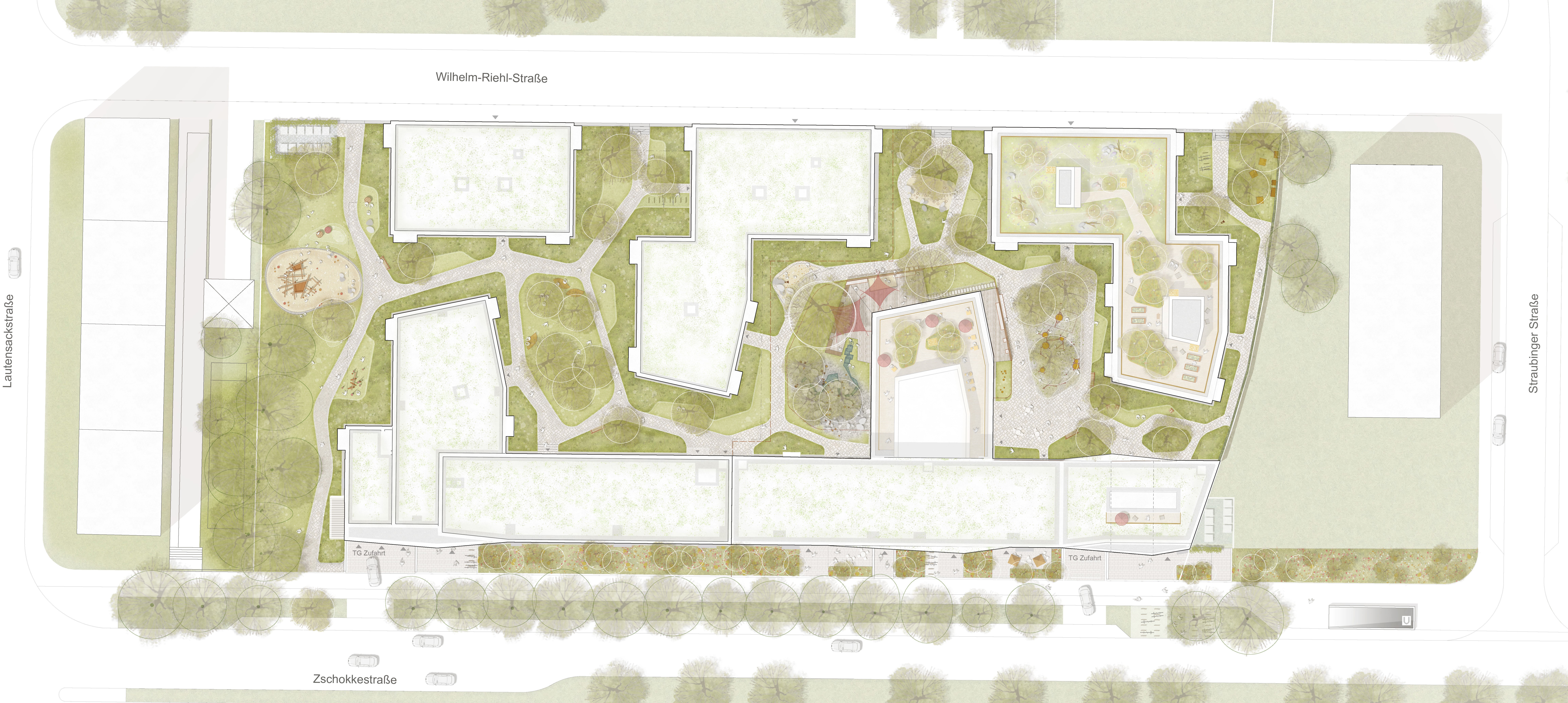 Neubau einer Wohnanlage mit 130 WE (PZ Ost) und 178 WE (PZ West) als freifinanzierter Mietwohnungsraum mit Laden, Gemeinschaftsräumen, integrierter Kindertagestätte, Tiefgarage und Mobilitätskonzept
